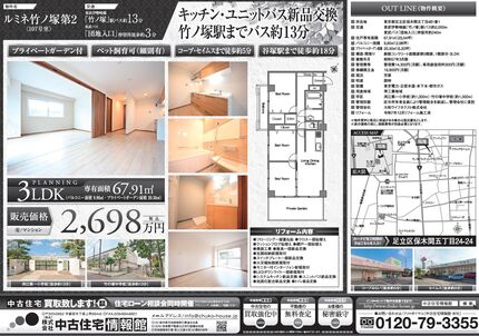 【足立区保木間】 竹ノ塚駅までバス16分 キッチン・ユニットバス新品交換 プライベートガーデン付 ペット飼育可(細則有) コープ・セイムス5分 渕江第一小学校13分