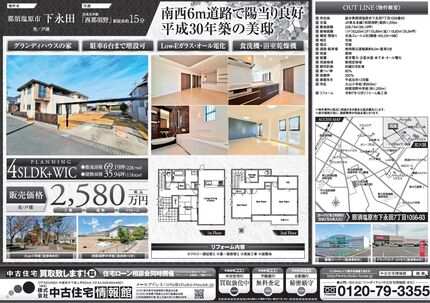 【那須塩原市下永田】 グランディハウスの家 駐車6台まで増設可 平成30年築の美邸 南西6m道路 西那須野駅15分 Low-Eガラス・オール電化 大山小学校8分